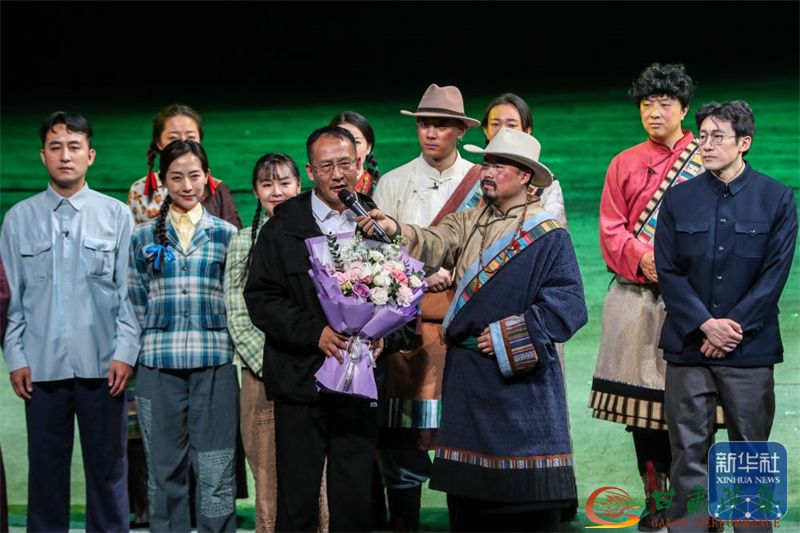 ↑ 1月28日晚,在甘肃黄河剧院,王万青之子王团胜(前左)在话剧《青青的阿万仓》演出结束后上台发言。