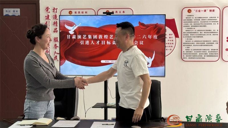 2026 年 3 月 12 日,甘肃演艺集团敦煌艺术团开展曲艺人才引进暨 2026 年度目标责任书签订仪式,仪式上,李鹏、李治恒两位优秀曲艺专业人才正式加入敦煌艺术团,并现场签订了年度目标责任书。