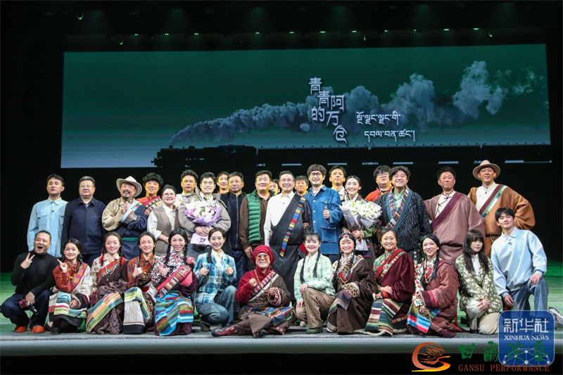 ↑ 1月28日晚,在甘肃黄河剧院,演职人员在话剧《青青的阿万仓》演出结束后合影。