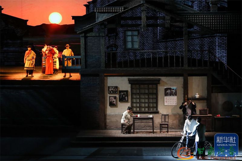 ↑ 1月28日晚,在甘肃黄河剧院,甘肃省话剧院演员在话剧《青青的阿万仓》中表演。