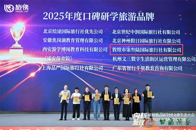 会上,甘肃演艺集团柒叁陆国际旅行社凭借其在研学旅游领域的持续深耕与创新实践,从全国众多参评企业中脱颖而出,荣获“2025年度榜样研学旅游品牌”称号。这一荣誉既是对专业能力的肯定,也反映了其在研学产品研发、服务优化与文化融合等方面的积极成效。