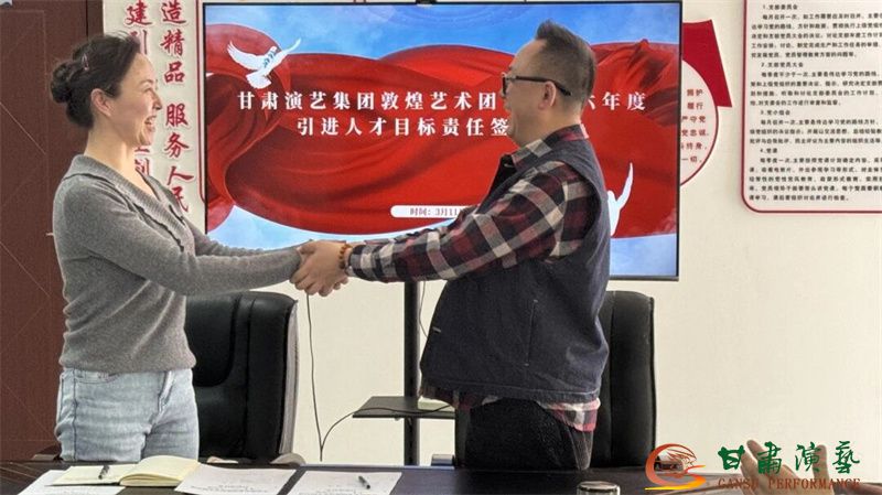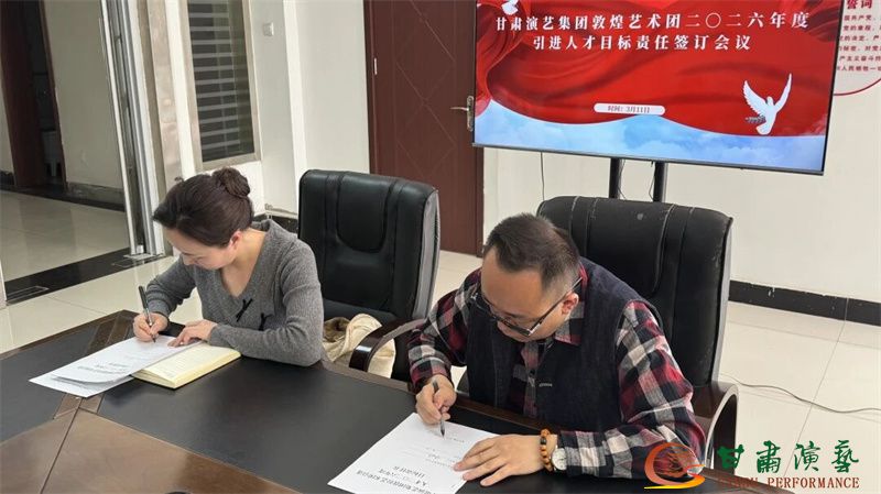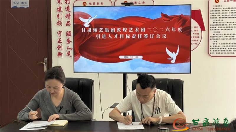 2026 年 3 月 12 日,甘肃演艺集团敦煌艺术团开展曲艺人才引进暨 2026 年度目标责任书签订仪式,仪式上,李鹏、李治恒两位优秀曲艺专业人才正式加入敦煌艺术团,并现场签订了年度目标责任书。