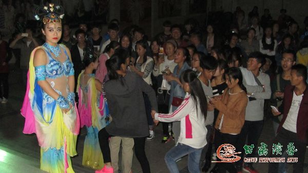 西北师范大学敦煌学院成立于2014年,学院开设美术学、舞蹈表演、动画共3个本科专业。学生都来自全国各地,由于中秋节假期短,学生们都不能回家过节。甘肃省杂技团特意邀请敦煌学院师生观看《敦煌神女》演出。